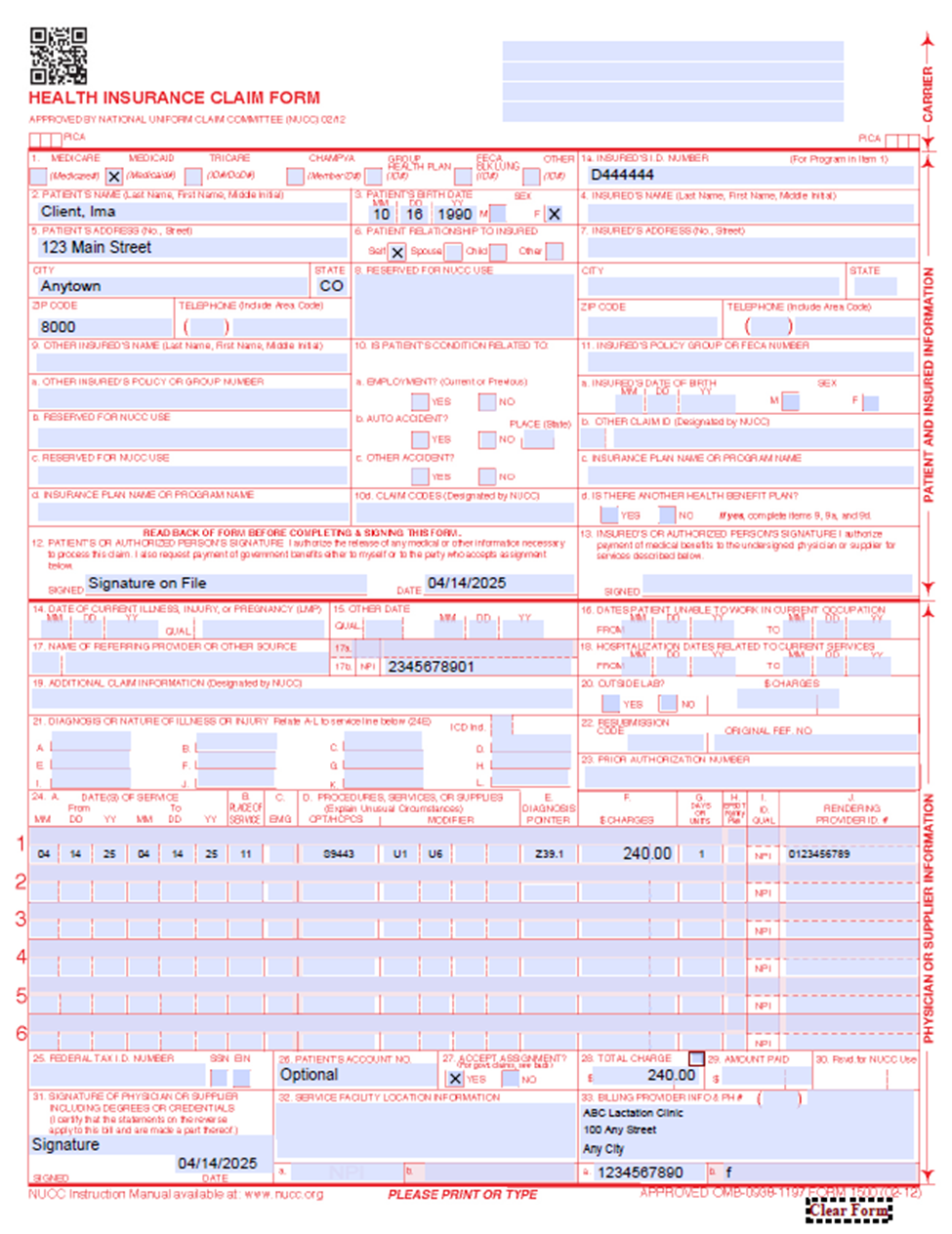 | 04/30/2025 | Updated billing information for lactation support services. Updated CMS 1500 lactation support services claim example. | HCPF |